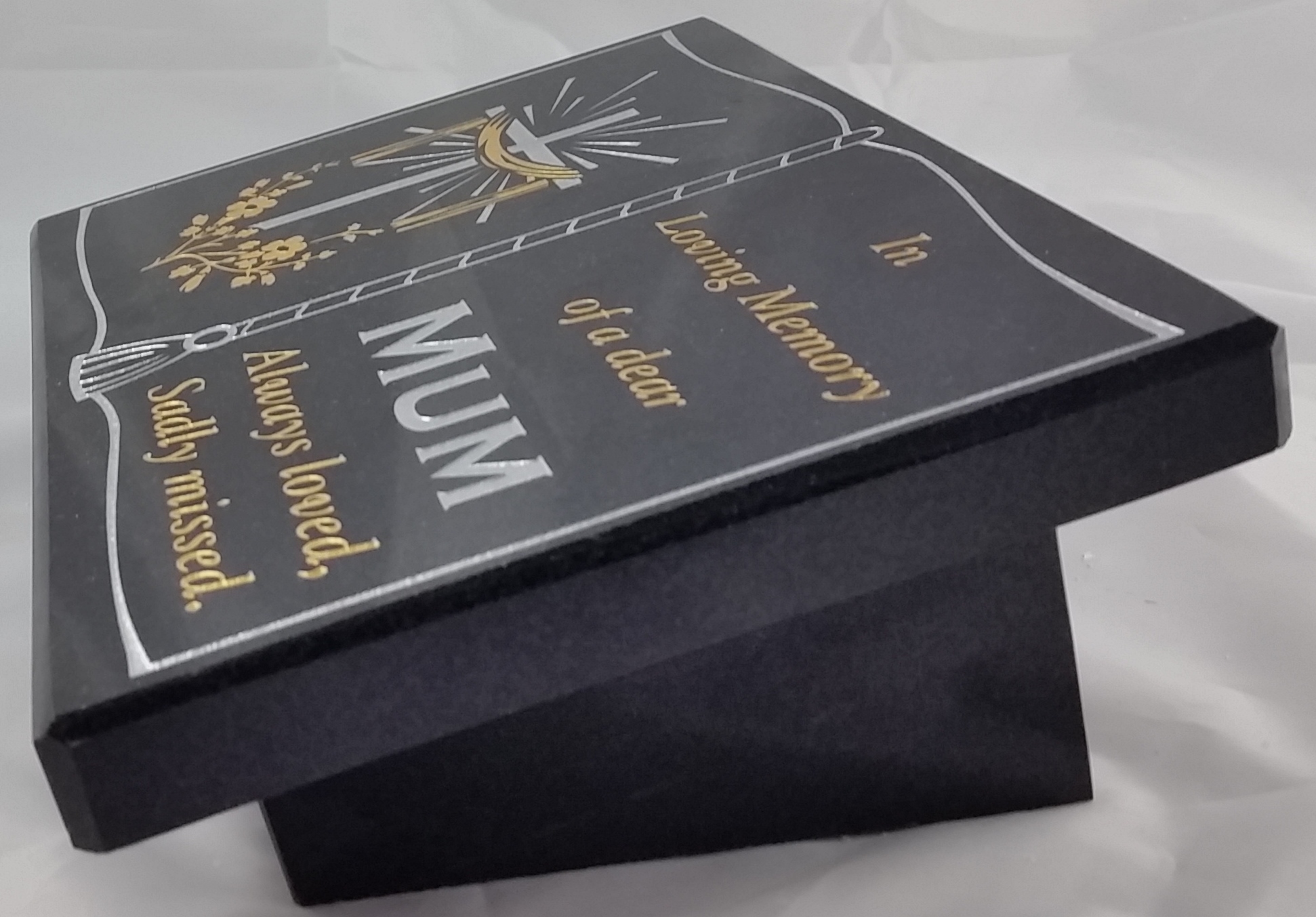 Small Personalised Sand Blasted Granite Plaque This Solid Granite Plaque is Sand-Blasted in our workshop and is hand-painted for you to give you a high quality product that will stand the test of time. This plaque is in a Book Style with an image on the Left Hand Side and a message on the Right Hand Side The wording / images on the plaque can be personalised to your liking to include your loved one's name etc Please choose from our wide selection of verses and images. Let us know if you require something different added to your plaque. Size in CM 22.4 x 17.2 Size in Inches 9" x 7"