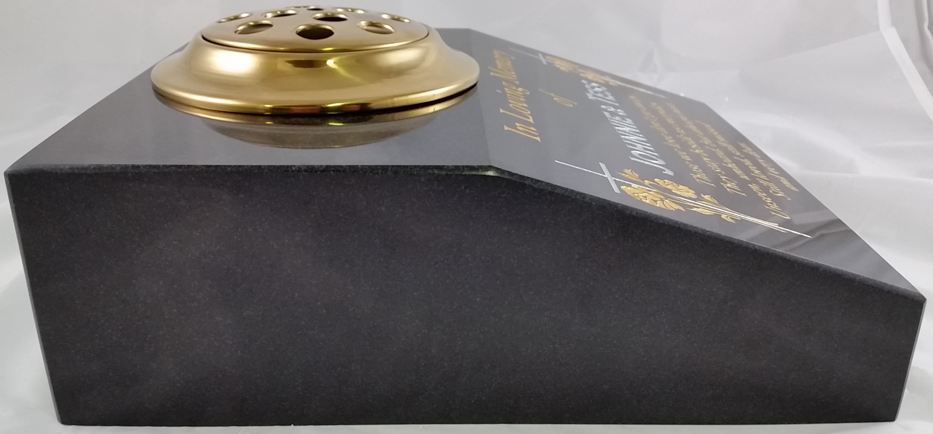 Description : Large Sand Blasted Granite Hex Vase This Solid Granite Vase is Sand-Blasted in our workshop and is hand-painted for you to give you a high quality product that will stand the test of time. The wording / images on the plaque can be personalised to your liking to include your loved one's name etc Please choose from our wide selection of verses and images. Comes with a gold-tone flower holder Let us know if you require something different added to your plaque. Product Code: 9109