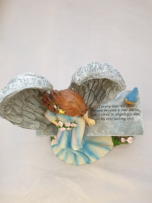 Description : Solar Angel sitting on bench with little blue bird. The verse on the bench lights up as darkness falls. The verse on the bench reads: 'If every tear we shed for you became a star above, You'd stroll in angels garden, lit by everlasting love.